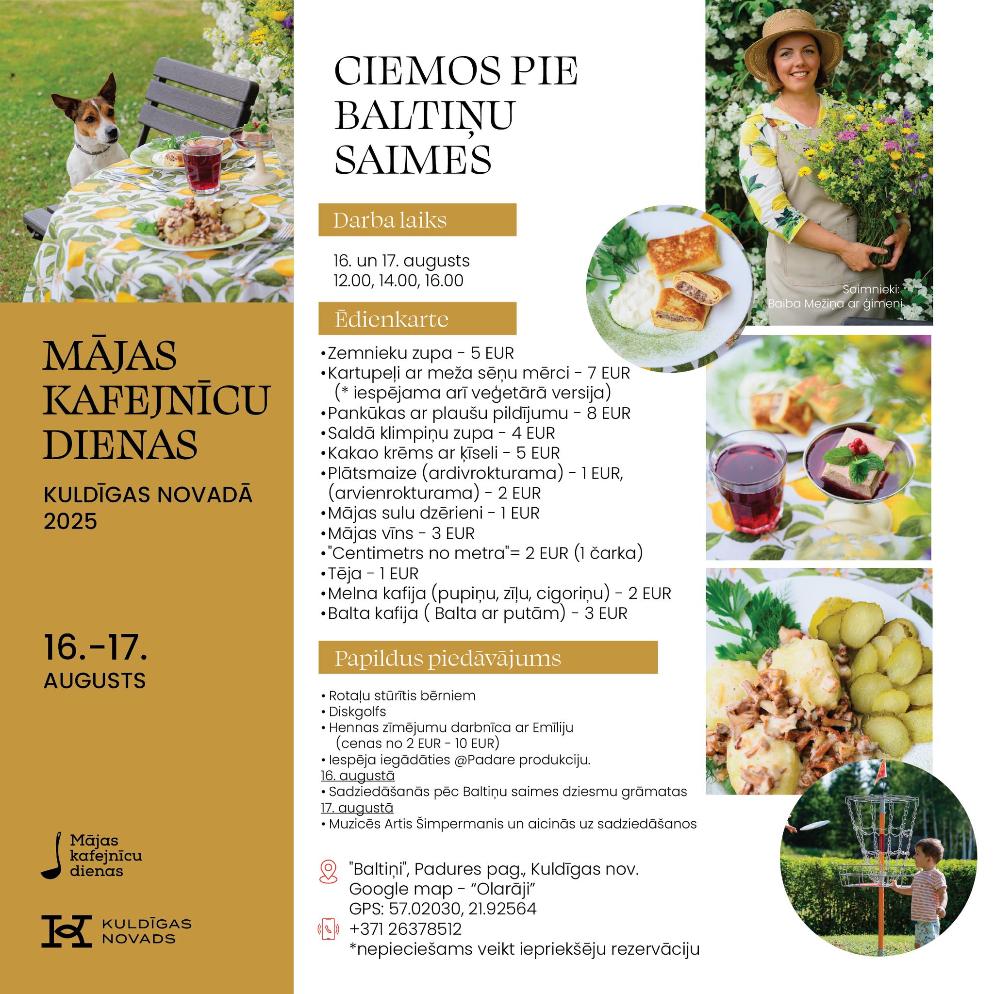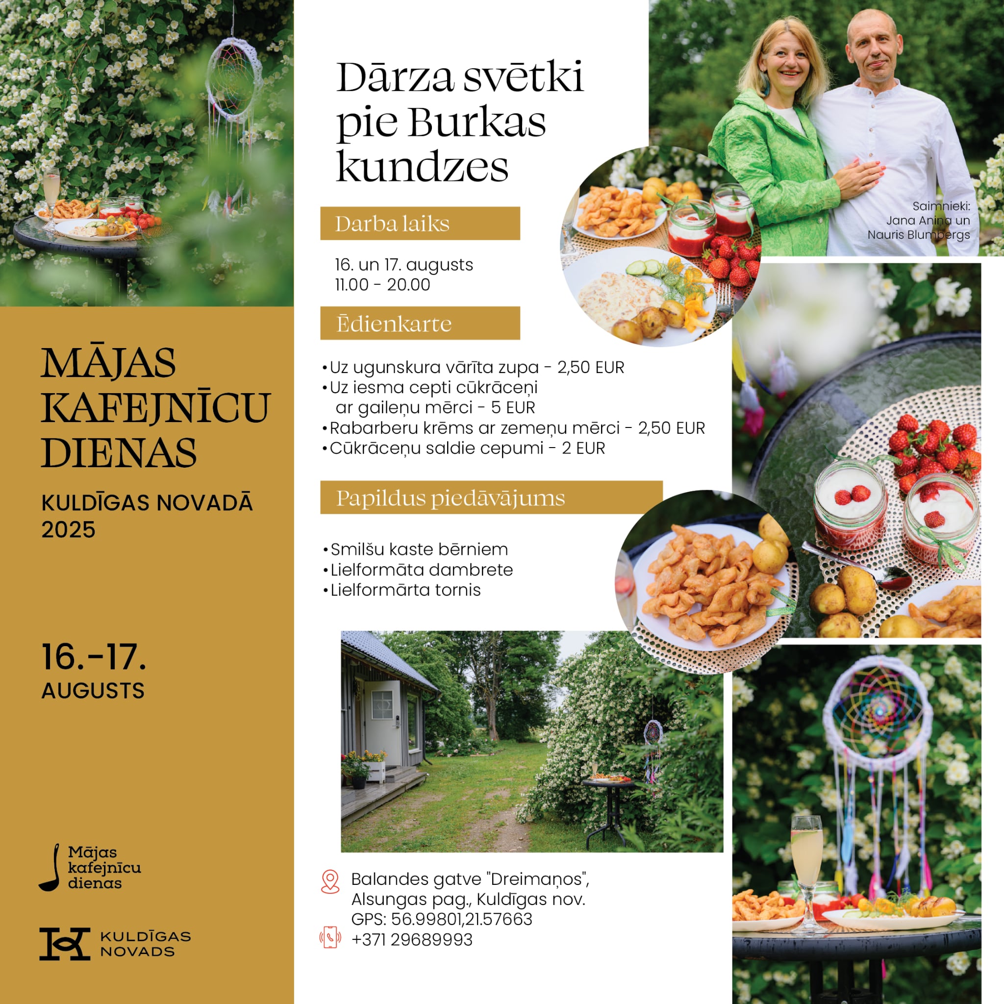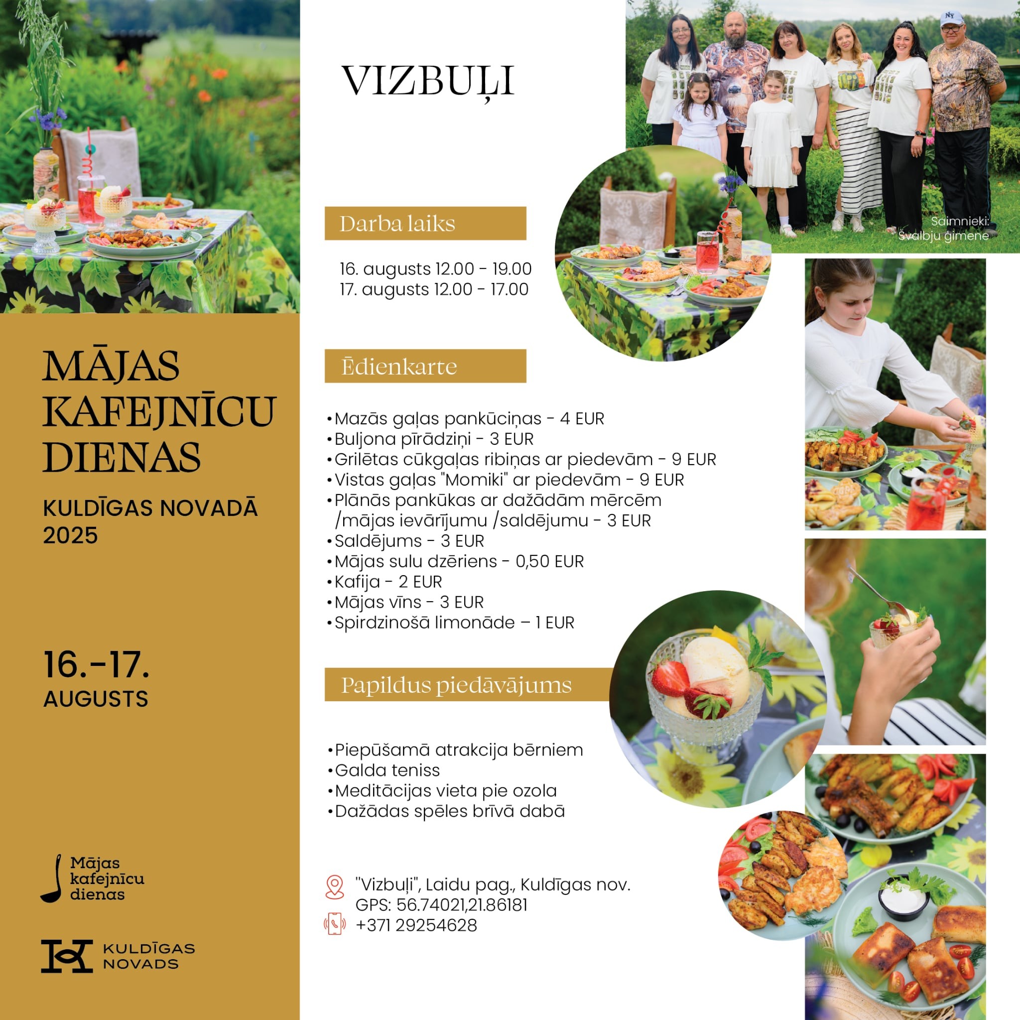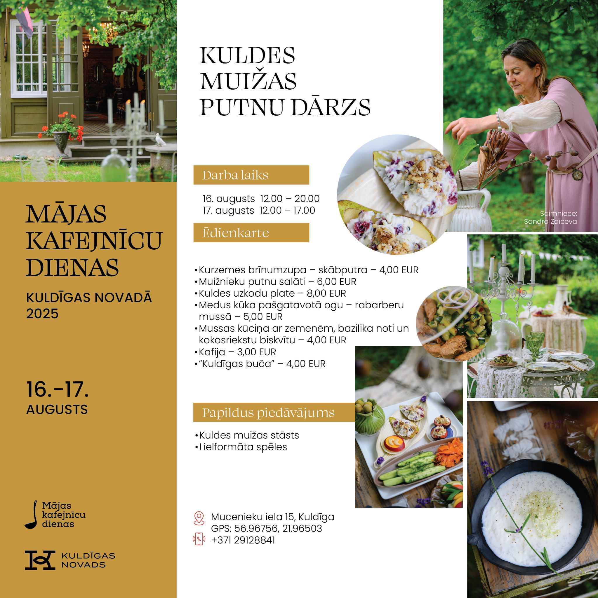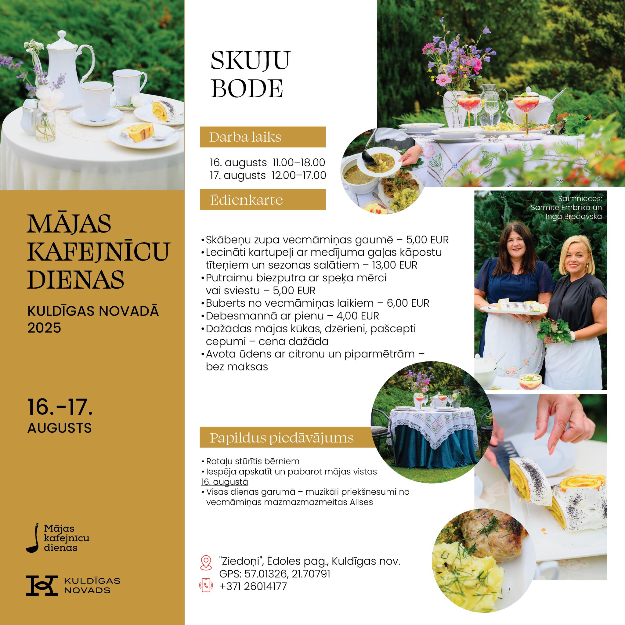 Vietējie saimnieki un saimnieces atvērs savu māju durvis, pagalmus un dārzus, pārvēršot tos par mājas kafejnīcām ar īpašu atmosfēru un gardiem ēdieniem. Kuldīgas novadā viesus gaidīs 11 kafejnīcas: “Trīsuļi’’, “Kuldes muižas Putnu dārzs’’, “Karnevāls Silniekos’’, “Vizbuļi’’, “Sapnis’’, “Bangotnes’’, “Ciemos pie Baltiņu saimes’’, “Skuju bode’’, “Spanga’’, “Dzimtais saulrieta krasts’’ un “Dārza svētki pie Burkas kundzes’’.