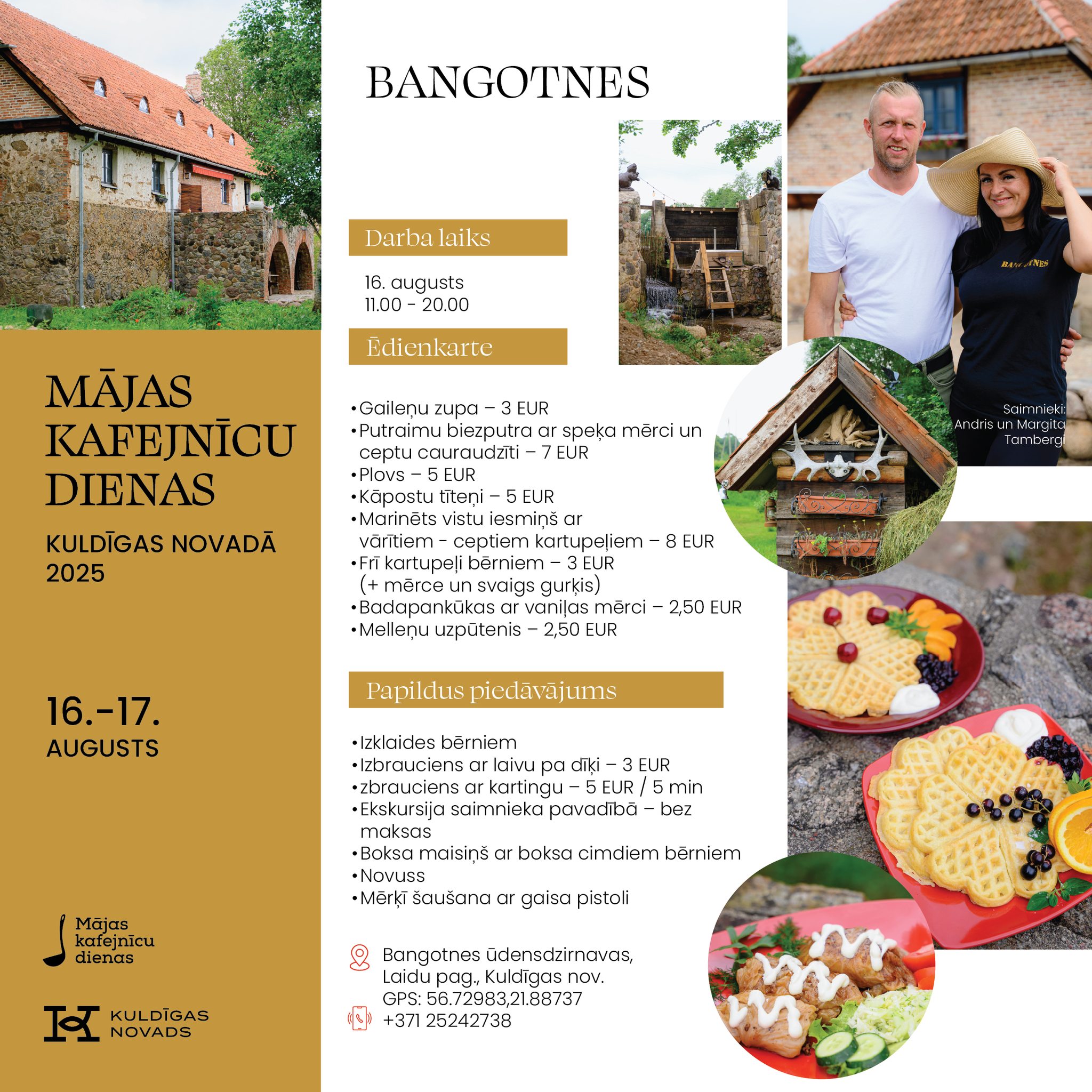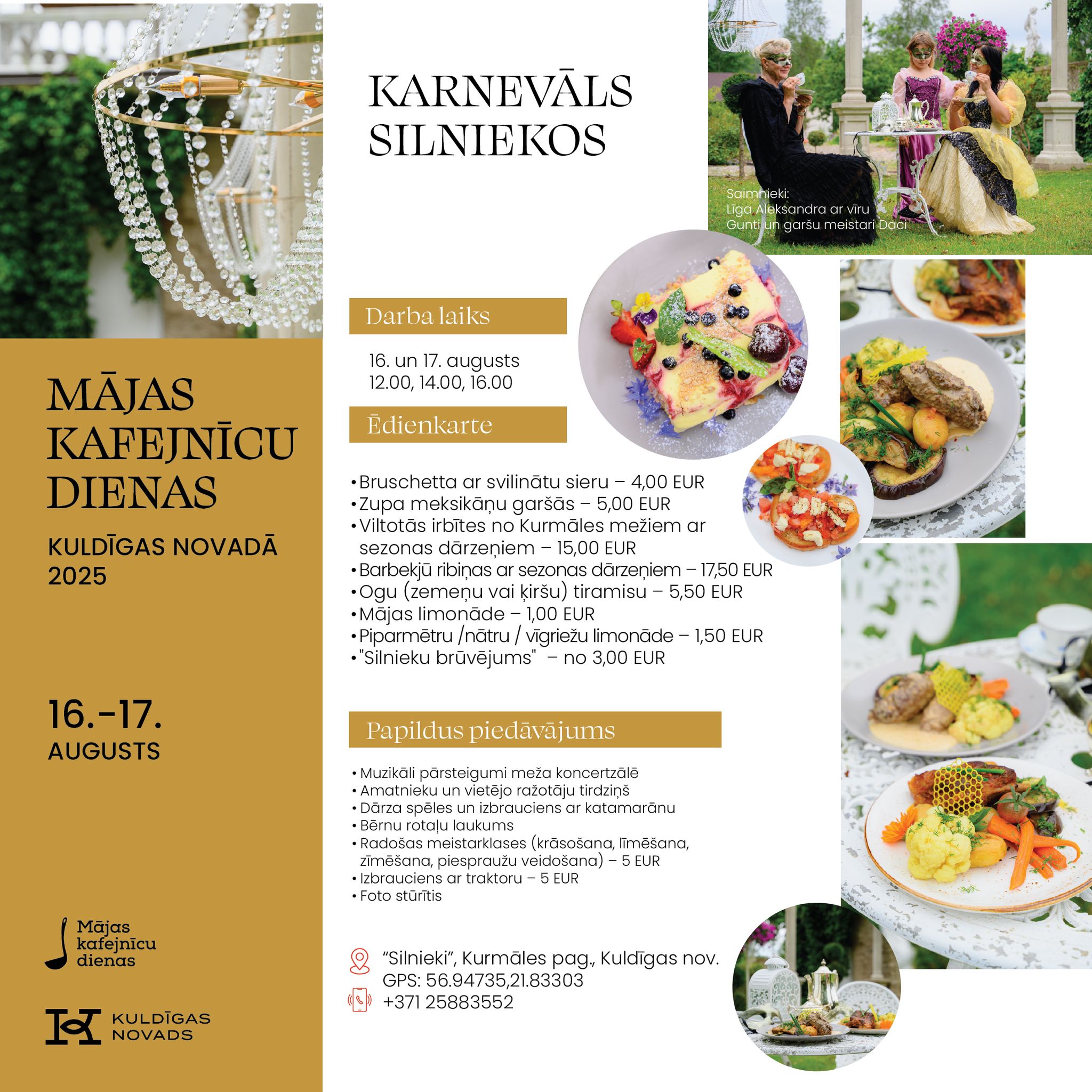 Informācija, ēdienkartes un kontakti pieejami www.majaskafejnicas.lv un https://www.facebook.com/search/top?q=visit%20kuldiga